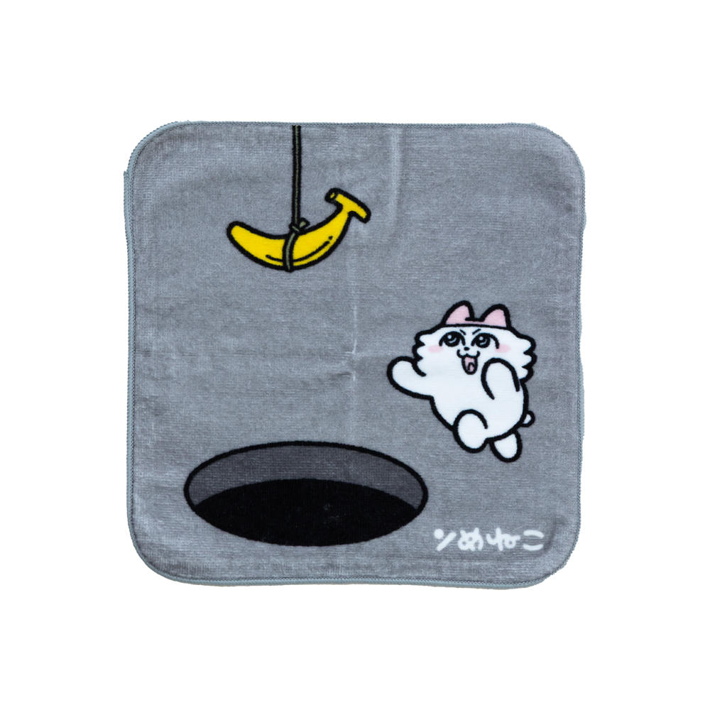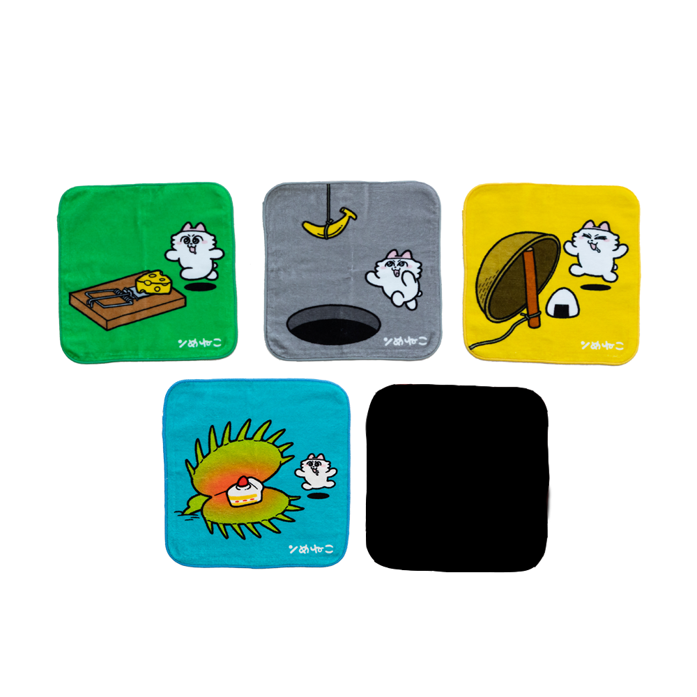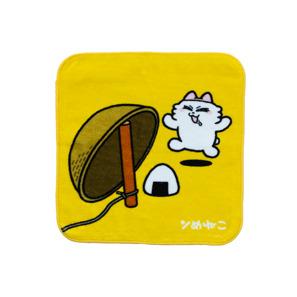 ンめねこが食べ物につられているカワイイイラストのトレーディングハンカチです。
