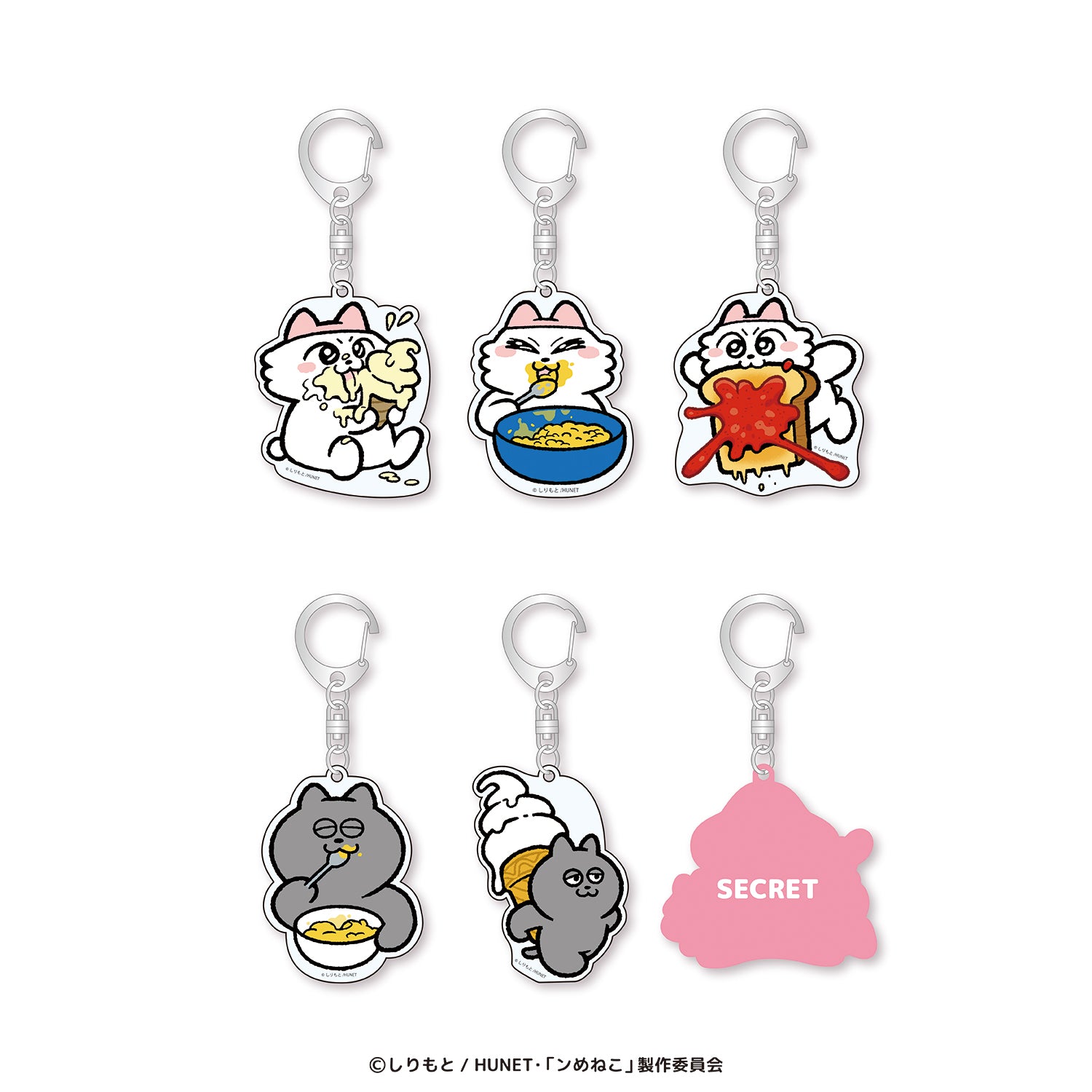 ンめねこの食べてるシリーズのアクリルキーホルダー。シークレット柄はホログラム入り。